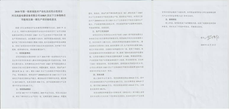 根據(jù)《河北省高技術(shù)產(chǎn)業(yè)發(fā)展項(xiàng)目管理暫行辦法》,2019年12月15日,邯鄲市發(fā)展和改革委員會(huì)在永年區(qū)組織召開(kāi)了由河北高晶電器設(shè)備有限公司承擔(dān)的110kV及以下立體卷鐵心節(jié)能變壓器一期生產(chǎn)項(xiàng)目(年產(chǎn)2000MVA S13型110kV及以下立體卷鐵心節(jié)能變壓器)驗(yàn)收會(huì)。會(huì)議邀請(qǐng)技術(shù)、經(jīng)濟(jì)專(zhuān)家組成驗(yàn)收組,驗(yàn)收組聽(tīng)取了項(xiàng)目工程竣工報(bào)告、技術(shù)總結(jié)報(bào)告和財(cái)務(wù)決算報(bào)告,審閱了財(cái)務(wù)專(zhuān)項(xiàng)審計(jì)報(bào)告及有關(guān)驗(yàn)收材料,并考察了項(xiàng)目現(xiàn)場(chǎng)。經(jīng)質(zhì)詢(xún)和討論,該項(xiàng)目完成了各項(xiàng)建設(shè)內(nèi)容,達(dá)到了批復(fù)的總體目標(biāo)和要求,同意通過(guò)驗(yàn)收。